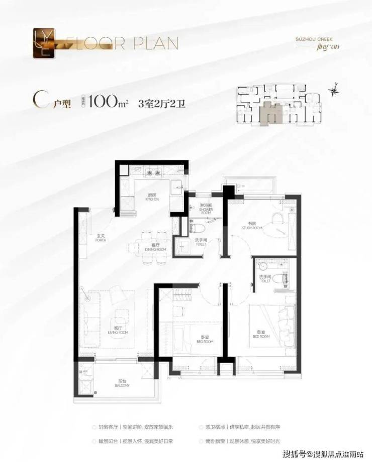 建筑面积约100㎡3房B&C户型:3房功能性符合市场主流需求,三开间朝南的布局保证充足光照。动静分离的设计让安静与活力同在。主卧套房设计,舒适度和私密性双爆表!