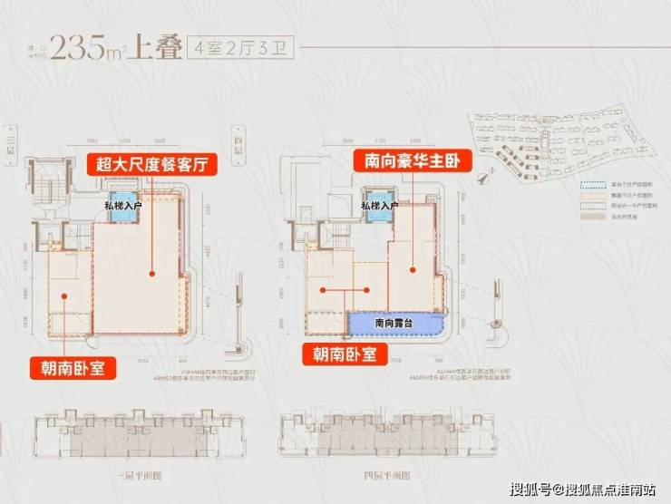 上叠功能性与下叠看齐,也是 四个朝南的全明卧室,主卧豪华套房配置 ,外接 南向超大露台 ,观星品茗无比惬意;