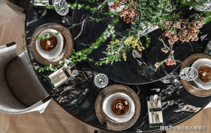 黑曜石桌面自带着高级的底蕴,为此处就餐铺垫了一层轻奢的韵味,花束色彩的温柔营造了就餐时美好的意境,带来了自然的浪漫。多元的美学汇集于此,让就餐变得浪漫且随性,伴随着美味的弥散,此处的生活也在逐渐升温。