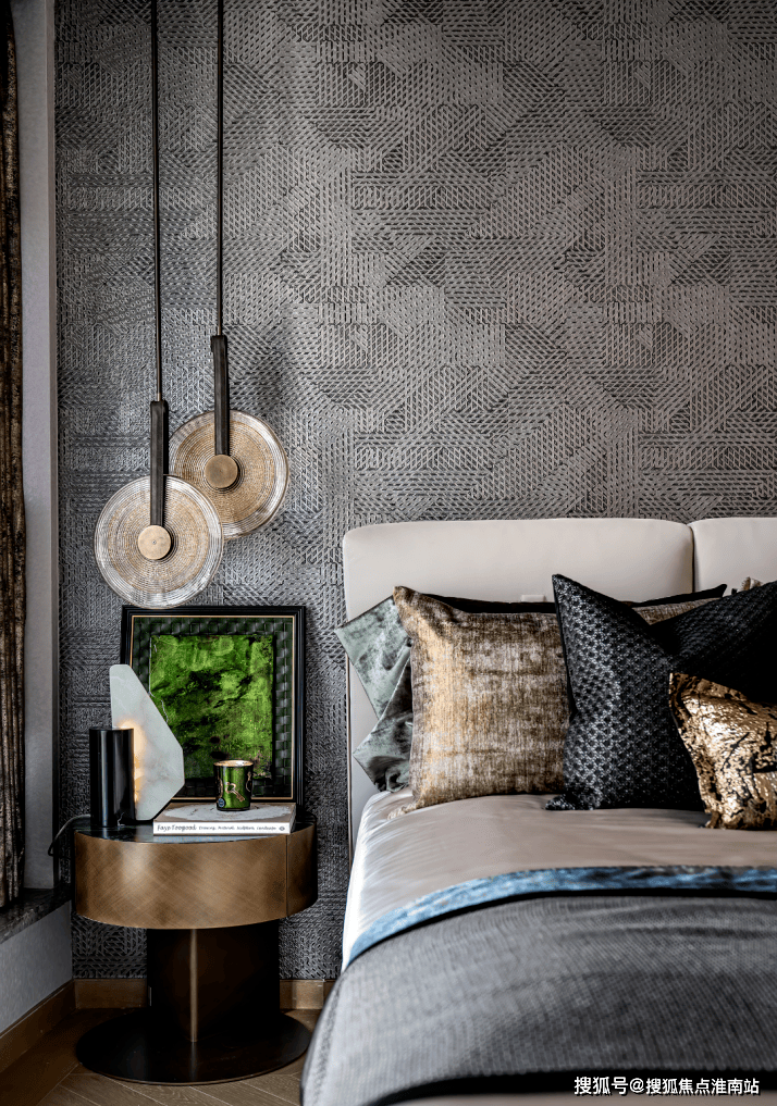 在另一间卧室中,设计师更多的运用了纹理作为室内的点缀,凹凸不平,细腻深邃,都是纹理赋予空间的深度,让生活有了更多的质感。