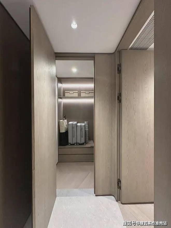 来看这里,入户左手边,拥有一扇隐藏门,打开是一个收纳空间,未来家中行李箱、吸尘器甚至是宠物粮等,都可以放在这里。