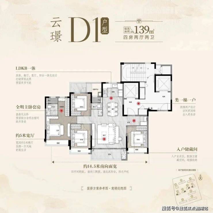 1、四大开间 面面朝南(南向面宽约14.5米)