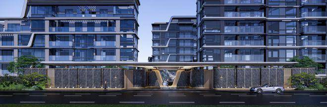 小区归家大门约100米的超级界面,选用45米的宽奢石铺装门头串联起流转水景,蓝翡翠镜面奢石,搭配范思哲黑定制水景,更显尊崇。