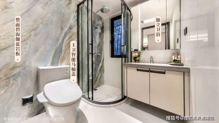 主卧预留衣柜空间,明亮观景飘窗,既能够节省空间,又能提高使用效率。 独立卫浴,智能马桶盖,搭配整面碧海伽蓝岩板,色彩高级,且富有艺术感,方寸之间,尽赋日常优雅时光。