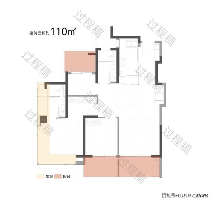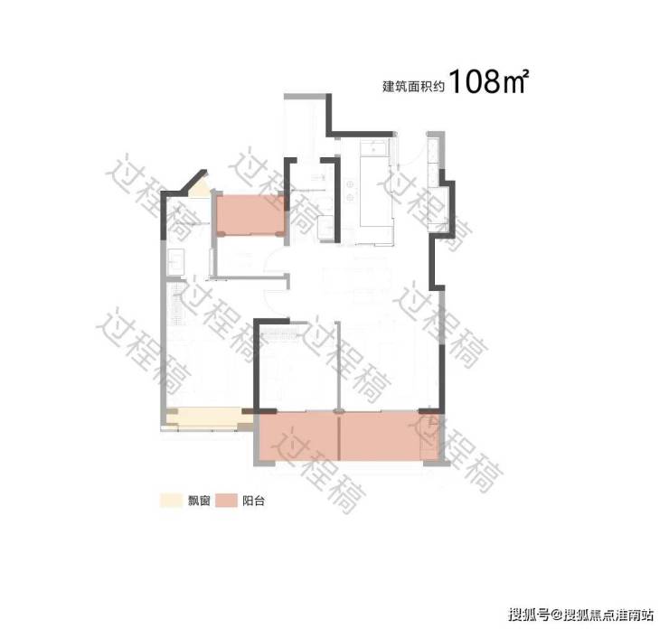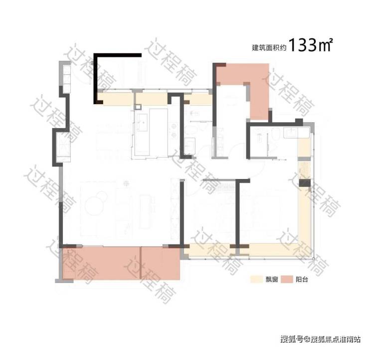 户型配备大面积飘窗(浅米色区域)和阳台(浅粉色区域),飘窗可引入柔和的自然光线,提升卧室等空间的明亮度;阳台则进一步拓展了采光面,同时有利于空气流通,保障室内通风效果,让空间更显通透舒适。