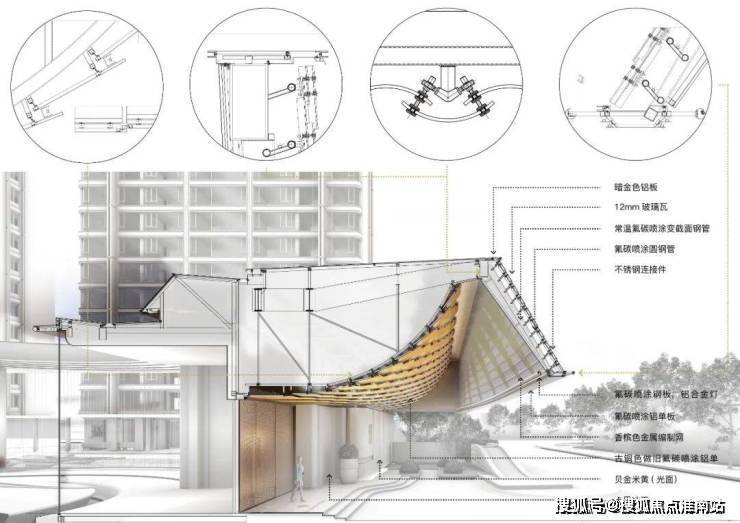 大屋盖下吊顶选用仿铜铝板,构件采用尺度统一的平面板块形成鱼鳞状叠色曲面,泛光设计与幕墙紧密结合,在相临吊顶之间暗藏灯具,从后往前打亮板块,达到“波光潋滟”的空间体验。曲面吊顶和门头之间形成一个挑高而尺度卷曲变化的怡人落客灰空间。水晶画卷,鳞片吊顶,这些成为落客区的主要视觉元素。