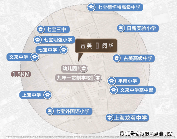 闵行是教育强区,古美阅华周边更是名校云集。约1.5公里内汇聚上宝中学、七宝中学、文来中学、明强小学、万源城协和双语学校等20所名校。另外还预留用地有一所幼儿园、一所九年一贯制学校(上海市文来中学)和一所国际学校。