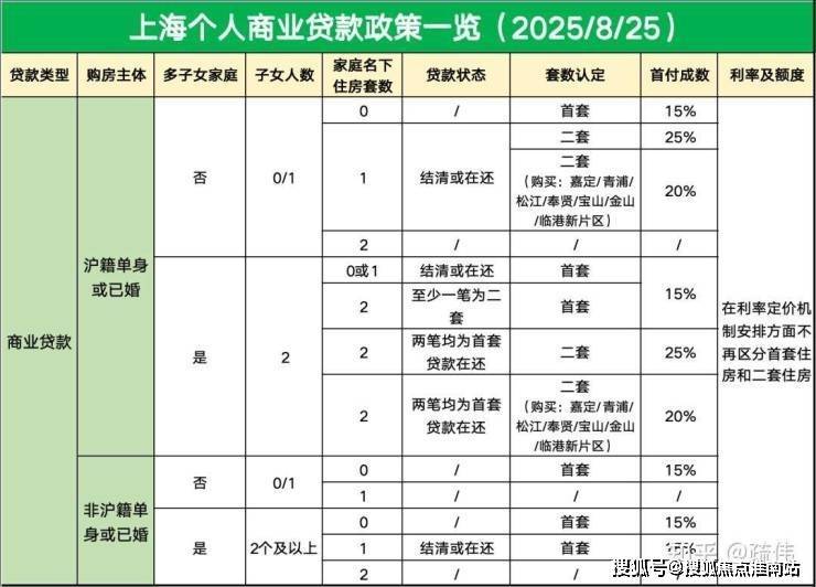 商业贷款首套二套首付比例暂未调整,首套首付 15%,二套首付 25%,二套购买五大新城(嘉定、青浦、松江、奉贤、临港新片区)及金山、宝山首付比例 20%。
