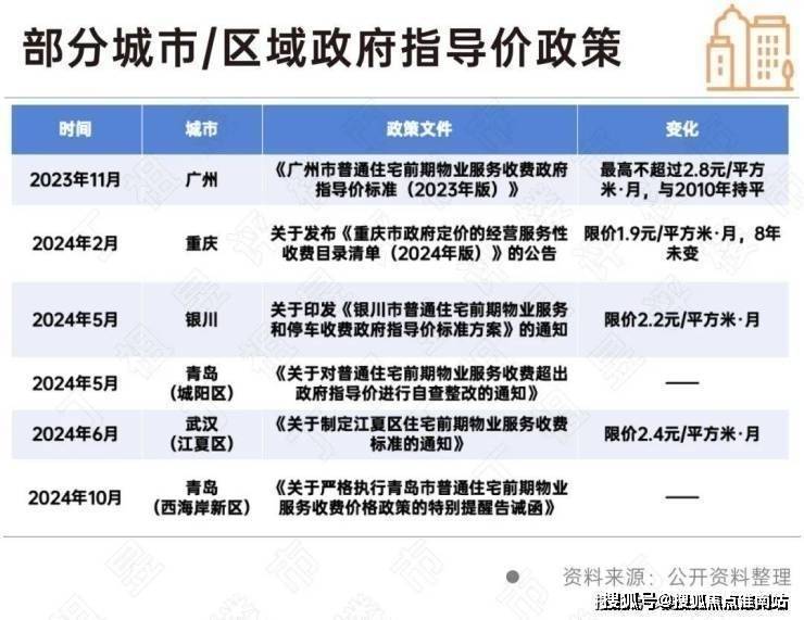 随后2024年5月,银川和青岛城阳区先后发布关于印发《银川市普通住宅前期物业服务和停车收费政府指导价标准方案》的通知及《关于对普通住宅前期物业服务收费超出政府指导价进行自查整改的通知》。