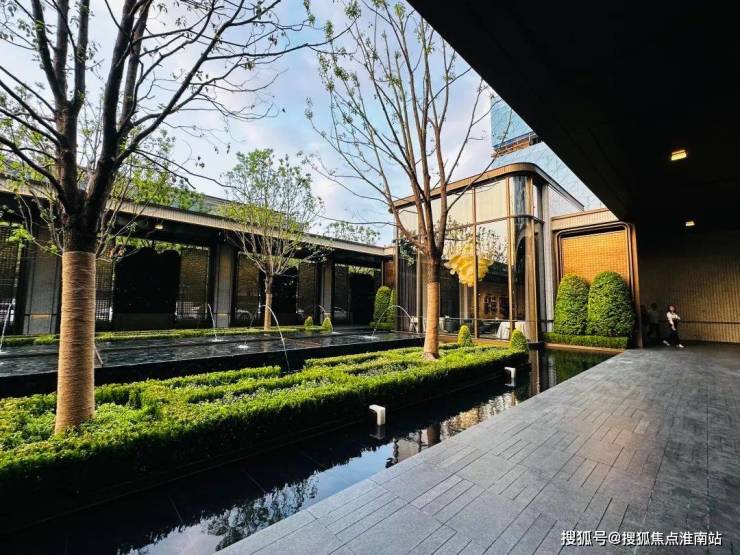 阵列跳泉、几何绿篱、水晶花房,水景底部都铺设 范思哲黑奢石,绿植形状也是经典的紫金翡丽甲第符号。
