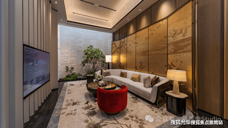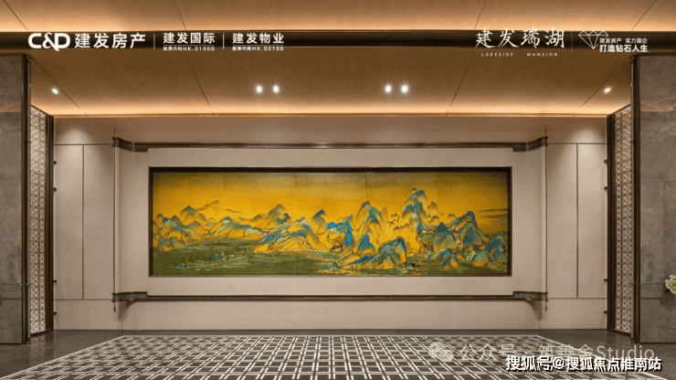 金山少见的双门规制,东门气势也尤为磅礴。步入其中,《蓬莱仙境》非遗漆画与西区山河遥相辉映,烟波浩渺处,藏风聚气,基业长青之意境油然而生。