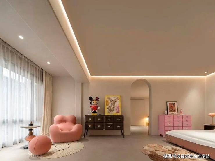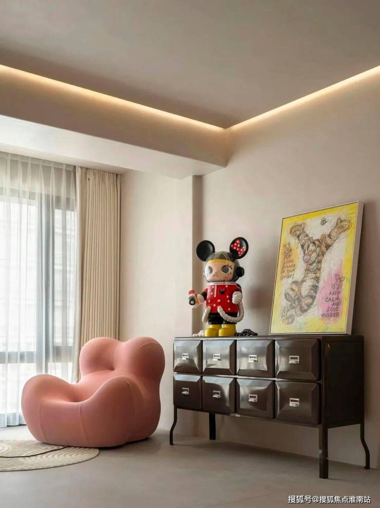 粉色与复古元素对撞,铺垫一种岁月维度,在活泼型家具和艺术画组合下,形成轻奢的日常质感。