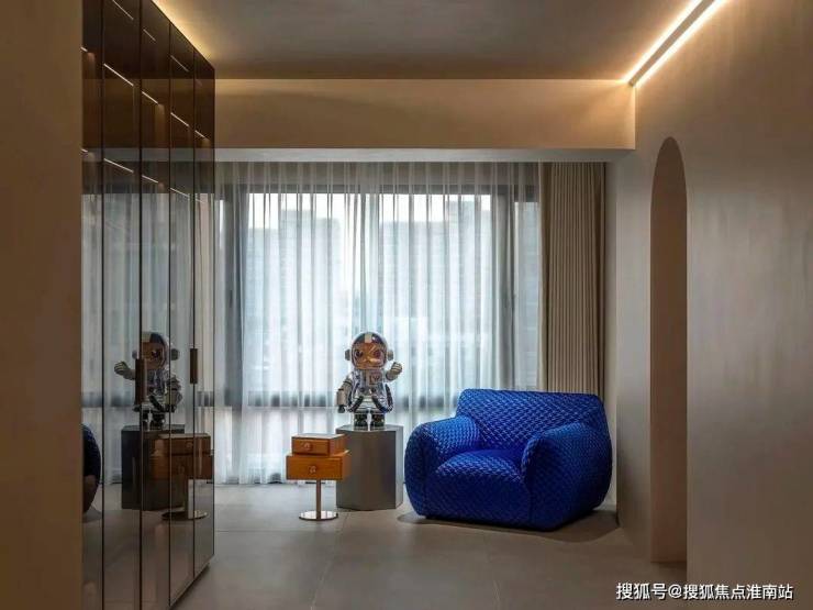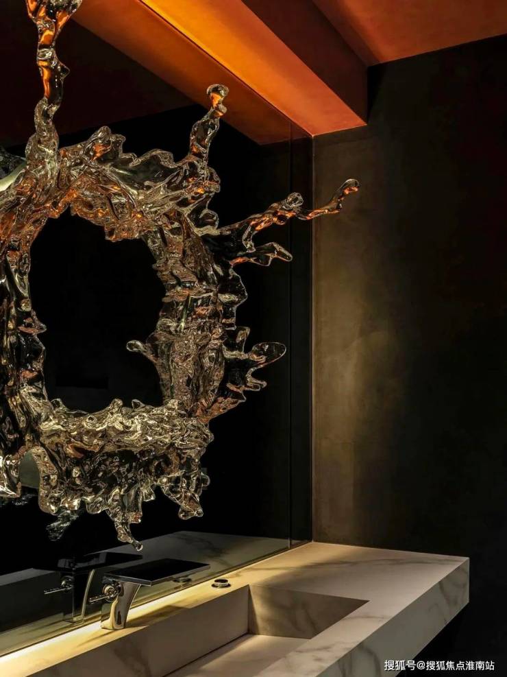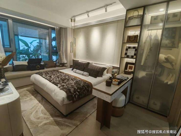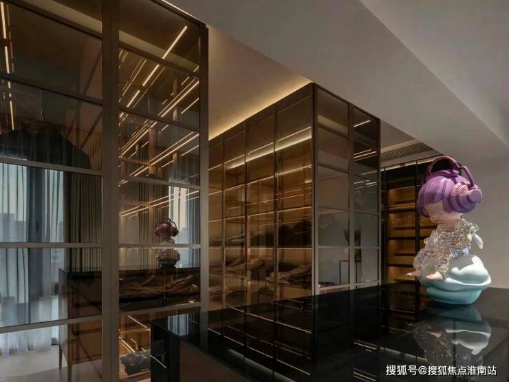 卧房包含大规模更衣间,利用琥珀玻璃组合深色材料,编织潮流轻奢的质感。且通过精致的日常装扮,赋予舒心的日常仪式。