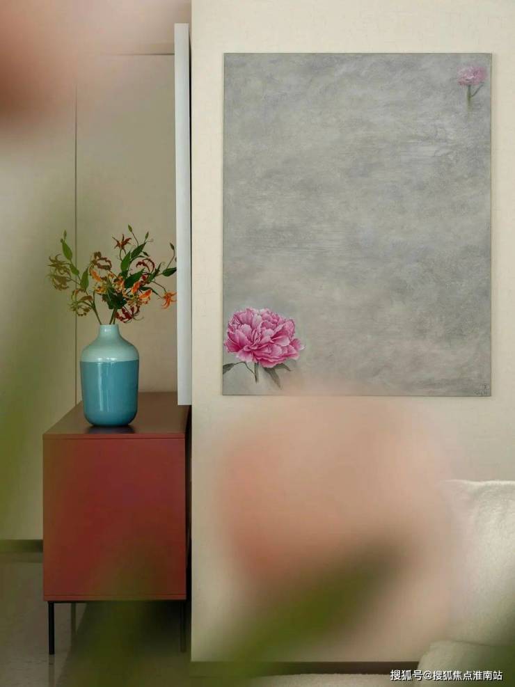 复古红柜子,搭配传统花瓶,仿佛一幅国风艺术画。