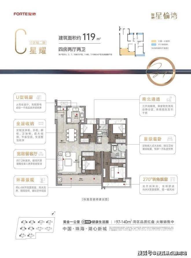 当前主推户型为:97-119-140㎡三房至四房两厅两卫,两梯四户,精装交付。