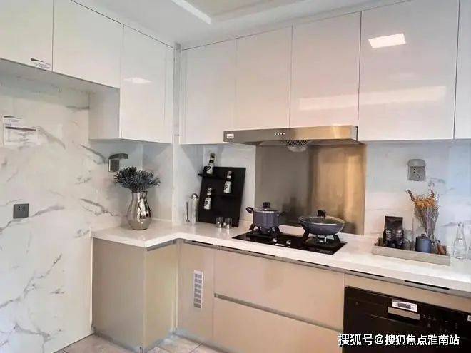 再往前走,左侧为L型厨房,预留了冰箱位,有采光窗,保证了厨房的换气和采光。