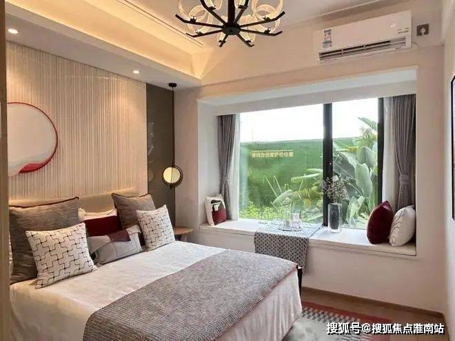 约6.4m的阳台连接客厅与卧室,整个户型三开间朝南,卧室均带大窗户,主卧还设计了270°的转角飘窗。