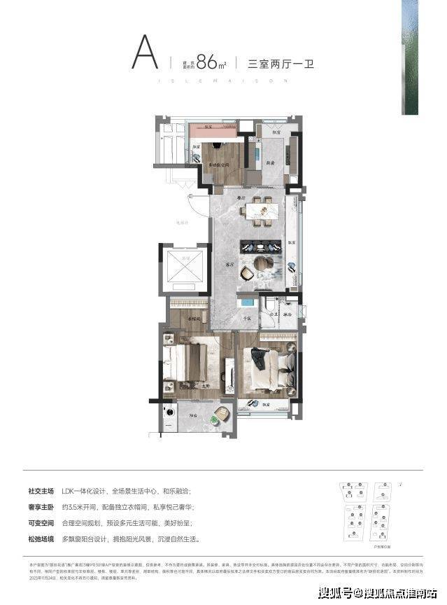 先来看建筑面积约86㎡的3房2厅1卫产品: