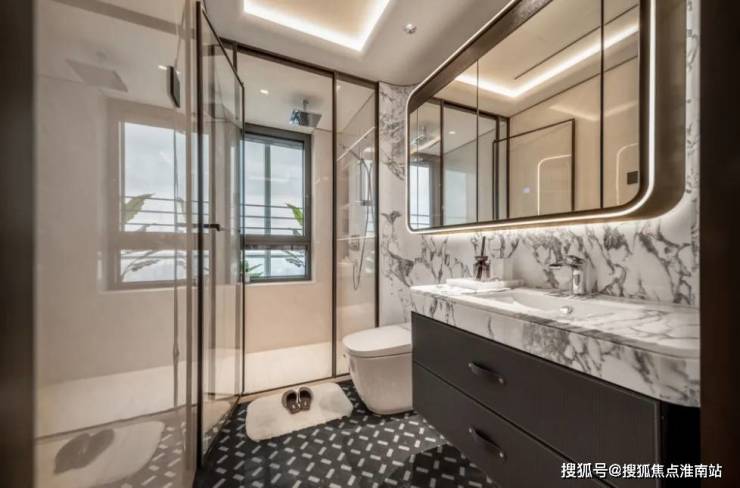 华润外滩瑞府售楼处电话☎:400-998-9694 大理石地砖的铺装工艺精湛,近乎看不出拼接缝,呈现出浑然一体的效果;吊顶采用悬浮顶设计,周边用金属包边,层次感十足;卫生间墙面不乏弧形处理,地板纹路的拼法也各有不同,通过复杂的工艺,只为呈现更优的视觉效果。