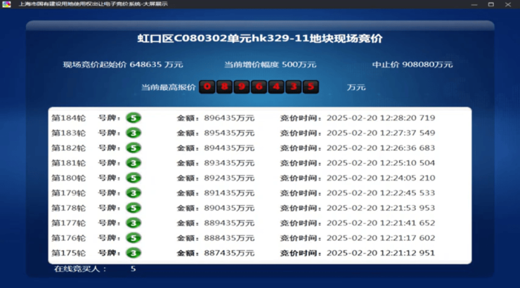2025年2月,今年第一批次土拍中,经过184轮竞价,金茂&庆隆联合体以总价896435万元竞得虹口C080302单元hk329-11地块,溢价率38.2%,折合楼板价117474元/㎡,装修标准不小于4000元/㎡。