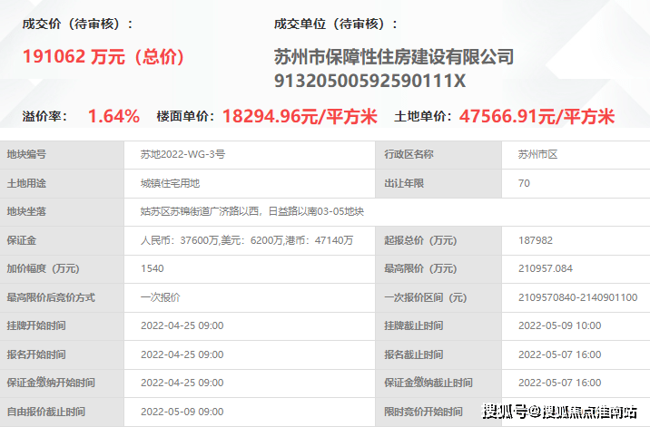 苏地2022-WG-3号, 位于姑苏区苏锦街道广济路以西,日益路以南,苏州市保障性住房建设有限公司在2022年5月9日以191062万元底价拿下, 成交楼面价18295元/㎡, 溢价率1.64%