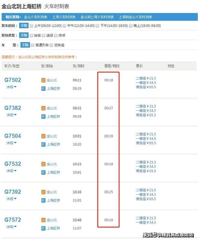 查询火车时刻表可以看到,金山北站到大虹桥核心枢纽只有1站,通勤时间远远低于十几站且站站停的地铁。