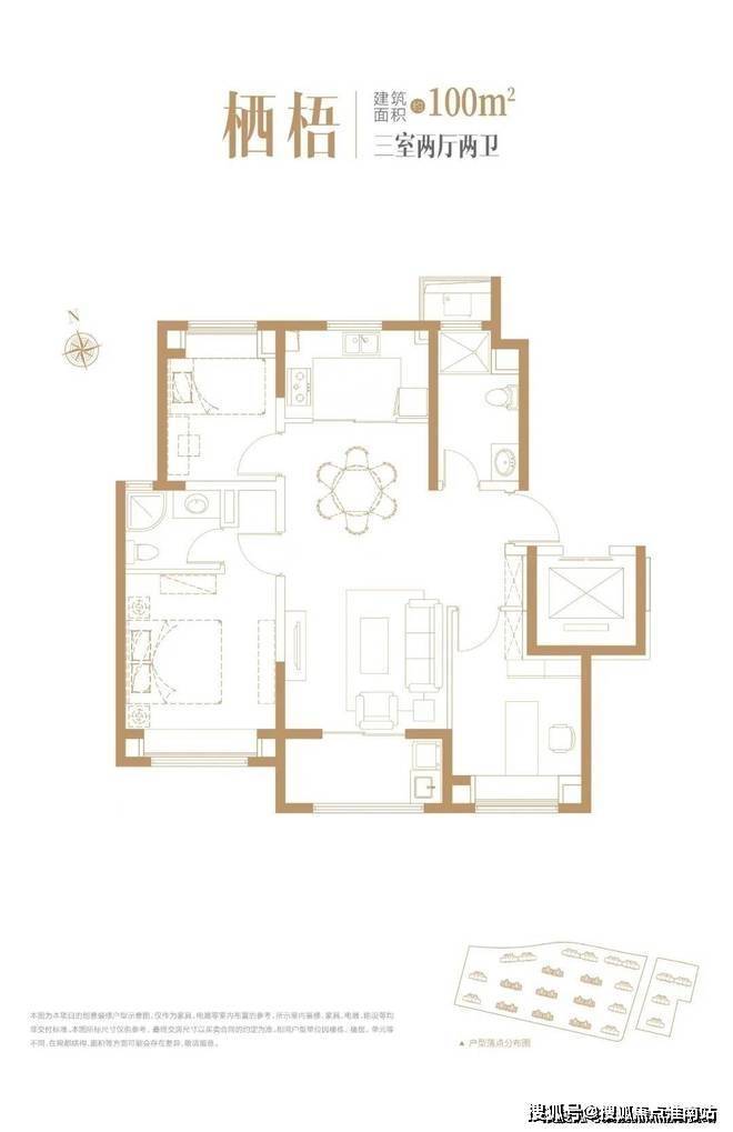 建面约100㎡户型3室2厅2卫▼