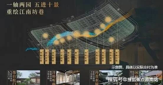 【园林】园林设计上依据“一轴两园 五进十景”规划,以豫园造景手法为基础,提取楼阁、折桥、墨池等中式元素,构建立体山水,重绘江南坊巷。