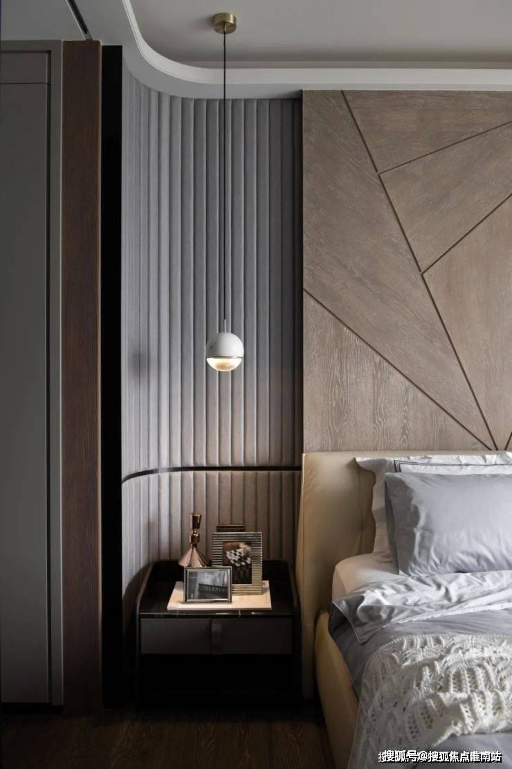 ▲床头柜上摆上精致的展示品,上方一盏球形的吊灯,在后方墙面的波纹软包造型的呼应下,也为我们布置了一个简约优雅的舒适空间感.
