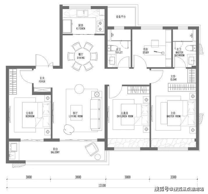 南向总面宽约13.1米,搭配着约6.8米阔绰双阳台,采光无压力。