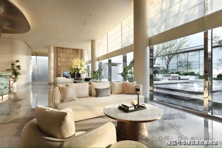 主入口大门以其宏伟的尺度彰显端庄与大气,高达7米的门庭让人瞬间感受到尊贵的气息。此门庭选用贝金米黄石材、维多利亚绿与白雪公主奢石,搭配古铜色金属板,巧妙融合冷暖色调,营造出极具张力的美学效果,开启都市奢华新境界。每一细节都透露出非凡的贵气。圆形镂空穹顶之下,一株近7米高的紫薇树卓然而立,阳光倾泻而下时,尽显“紫气东来”的祥瑞意韵。
