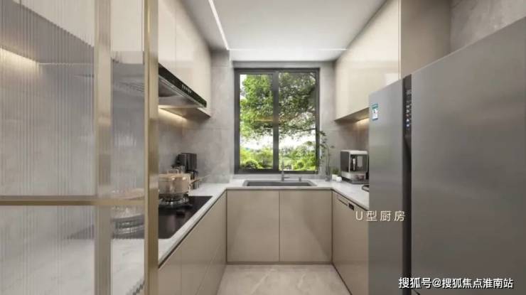 厨房 U型操作台面,操作空间充裕;更值得点赞的是 预留了双开门冰箱位置,你要知道普通百平米三房,基本只预留单体冰箱的空间。