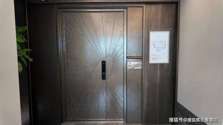 除105㎡以外的大户型(117㎡、143㎡),均为这种子母门设计,非常大气。每户门旁都有一个带射灯、奢石背景以及项目LOGO的门牌号。