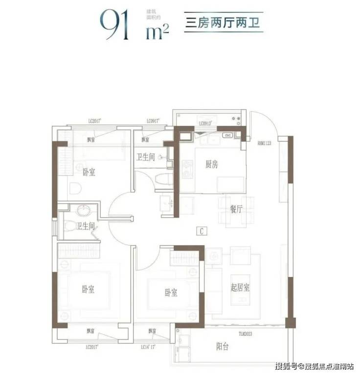 建面约91㎡ 3房2厅2卫▼