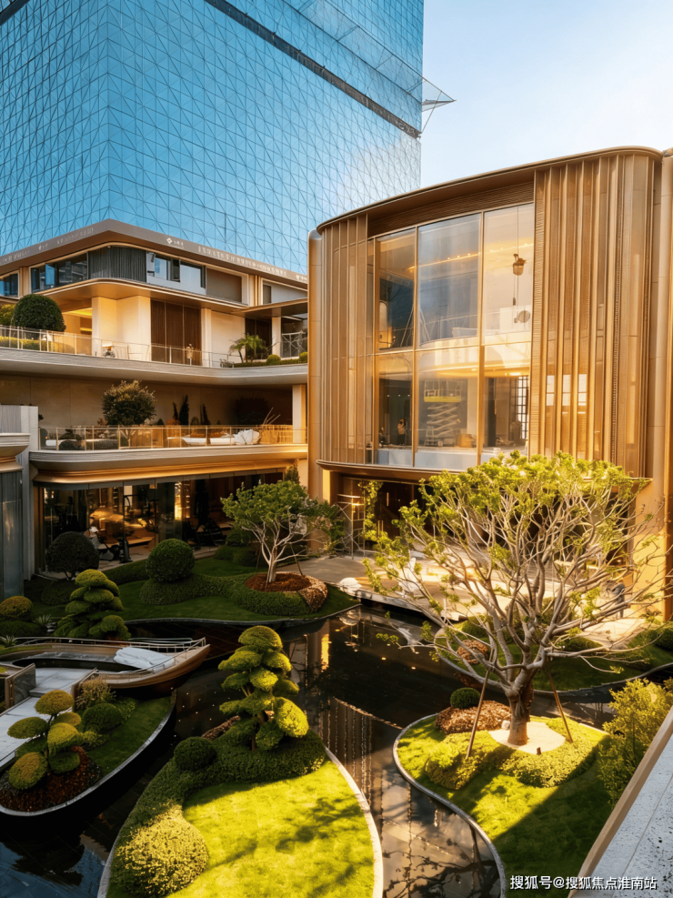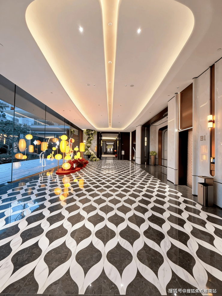 小区大门以“云扉初开”为灵感,打造具有仪式感的礼仪入口。宽约66米、高约8.6米的恢弘门庭,与酒店式归家大堂共同构筑,打造出极具仪式感的序厅,瞬间开启归家的尊崇心境。入口处精心打造的树阵水院,以静谧尊贵的氛围迎接归家。巧妙运用高差设计,通过层层递进的景观节点,优雅地引导业主步入社区深处。