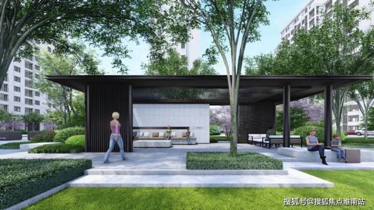 室外会客厅面向草坪,是邻里交流、休憩会客的好地方;健身活动区和儿童活动区一体化布置,看护孩子的同时,也可以健身活动。