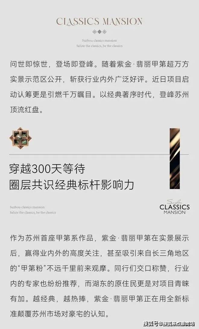 苏州豪宅紫金翡丽甲第官方电话:400-8818-994✔(官方售楼处预约看房热线)项目产品引入北京金隅&保利置业两家TOP级产品系,「紫京系」X「甲第系」,打造纯正的高端改善。超奢精装、高定会所、五星级酒店式归家、颜值外立面…每一处都在彰显它不可比拟的产品力!