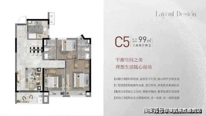 建面约99㎡3房2厅2卫,做到了三开间朝南+动静分离+南北通透+双卧室朝南+主卧套房设计+明厨明卫,室内通透明亮。