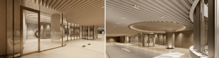 地下一层大堂同样沿用弧线元素,落客区+等候区+下沉庭院+电梯厅,完整功能区,为地下动线提供了丰与圆柱结构呼应,勾勒出落客区内凹的包裹曲线。下沉庭院引入自然光线,即便在地下,也是通透、明亮的通过体验。