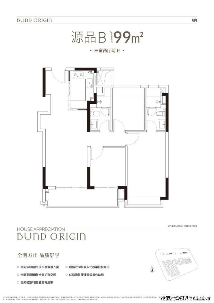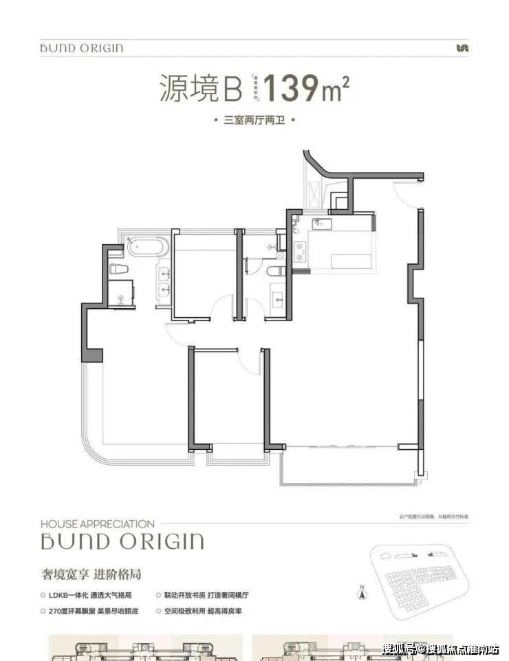 B户型是3房2厅2卫格局,三开间朝南+LDKB一体化+奢阔宽厅+全卧室带飘窗+主卧套房设计+动静分离+主卧270度飘窗,舒适度更高。外滩源著 复兴里 售楼处电话:400-9659-259
