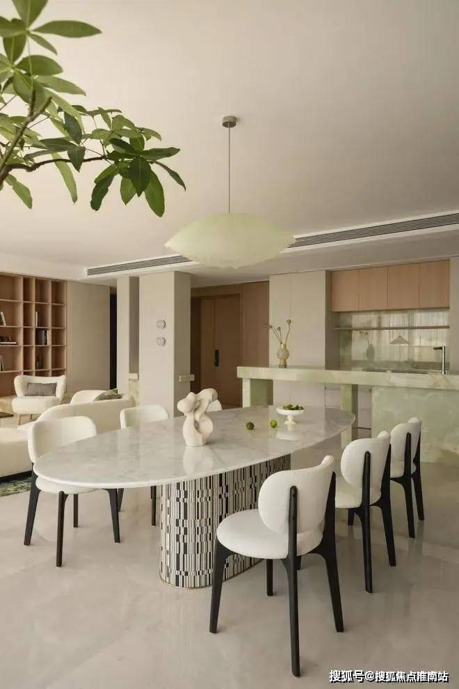 餐厅的设计采用了客厅的弧度元素,鹅蛋形的餐桌搭配轻巧的黑白椅,底座的黑白相间木皮增加了空间的艺术感,厚重的底座不再沉闷。