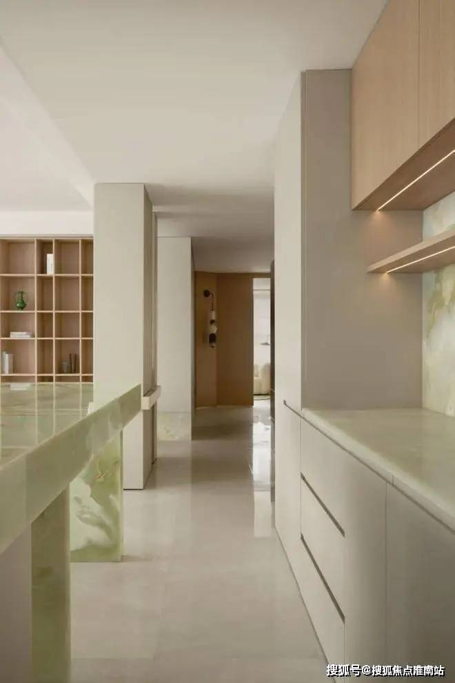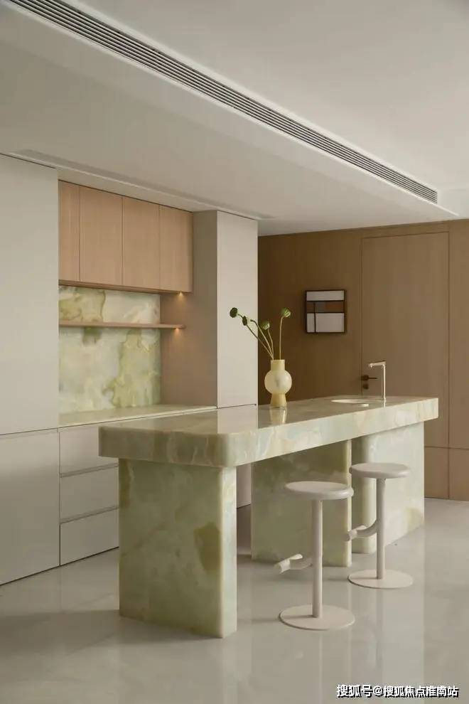 西厨岛台的设计具有强的视觉重心,运用温润的青玉做整个体块的包裹,结合了立柱与镂空的设计,使得整个空间看起来更加透气和谐。