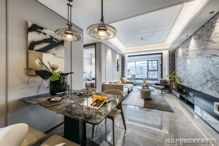 客厅的电视背景墙配备了岩板定制背景,客餐厅及卧室均墙布交付,均为高端住宅才有的配置。