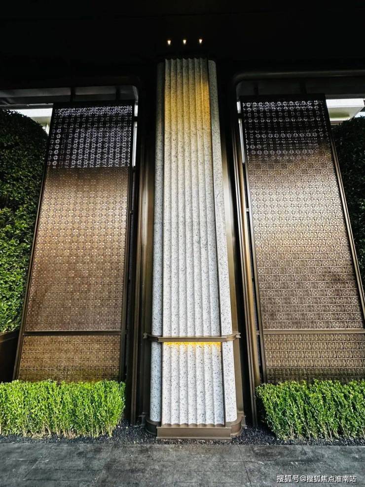 对称式造景,中部柱形 圆弧立柱,两侧 铝板雕花屏风,屏风上的纹样是紫金翡丽甲第的专属符号,两侧辅以树木阵列,经典气派。