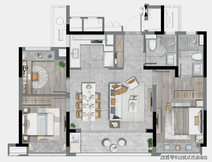 LDBK一体化的公区,充分实现了家庭成员间的互动;除了边厅外接的阳台外,南向次卧同样设计了阳台,兼顾了景观和晾晒的需求。