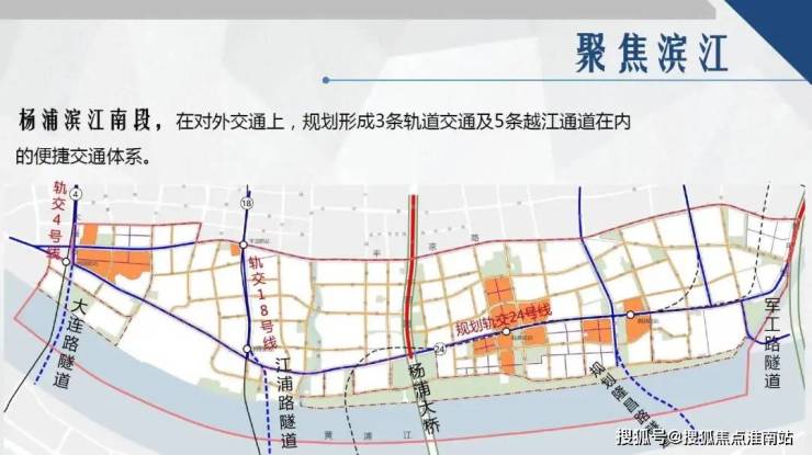 交通方面:杨浦滨江已有3轨5隧道交通格局,4/12/18号线环伺,坐拥江浦路隧道、杨浦大桥等,未来更有24、26号线规划中,交通能级领先。