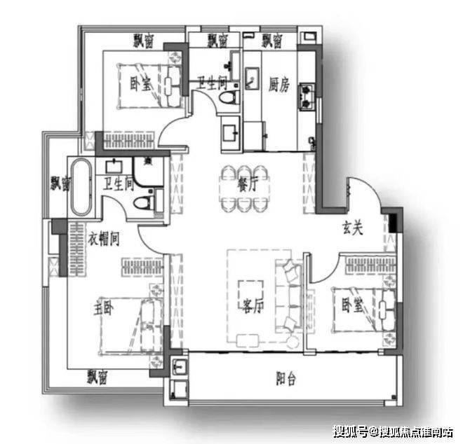 算是比较经典的飞机户型,三开间朝南,客厅面宽约4.5米,南北直通,客厅与南次卧阳台贯通,厨房附赠飘窗;