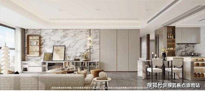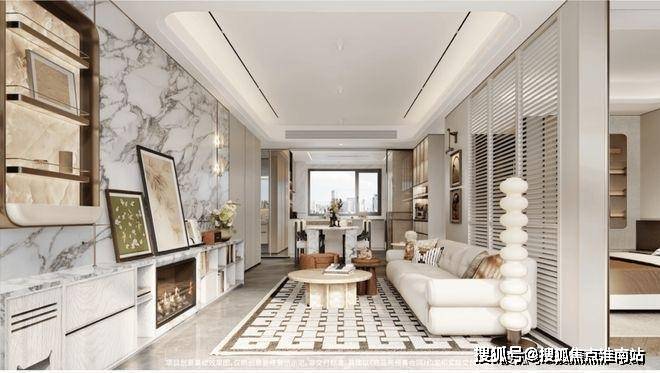 天地墙系统:宝格丽岩板、混油饰面板等搭配,地砖通铺、金属线条,匠筑现代美学空间,通透有质感。