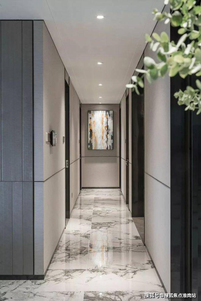 透过鞋柜看向过道,门全部做了到顶的处理,中间的腰线在公共开放区域是整体贯穿的元素,并结合柜门的开启高度,硬包的中线高度等等做了一个整体的联系。