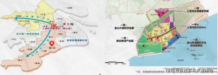 上海·金山根据 《虹桥国际开放枢纽建设总体方案》,金山将全区域纳入 “南向拓展带”,融入虹桥枢纽战略。以联动杭州湾,实践2035长三角一体化发展战略,树立上海西南重要门户。通过打造“上海湾区”城市品牌,成为产城融合样板城市、滨海花园城市、门户节点城市。